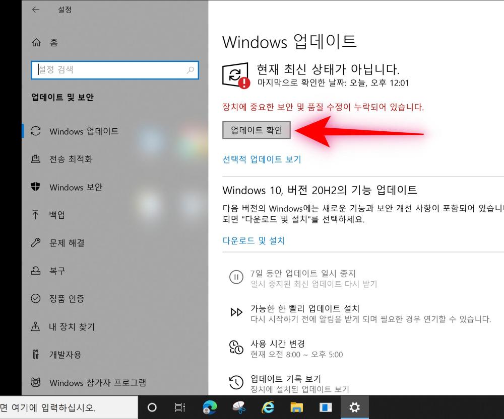먼저 윈도우 업데이트 방법에 대한 설명입니다. 윈도우를 업데이트하는 방법은 아주 간단합니다.