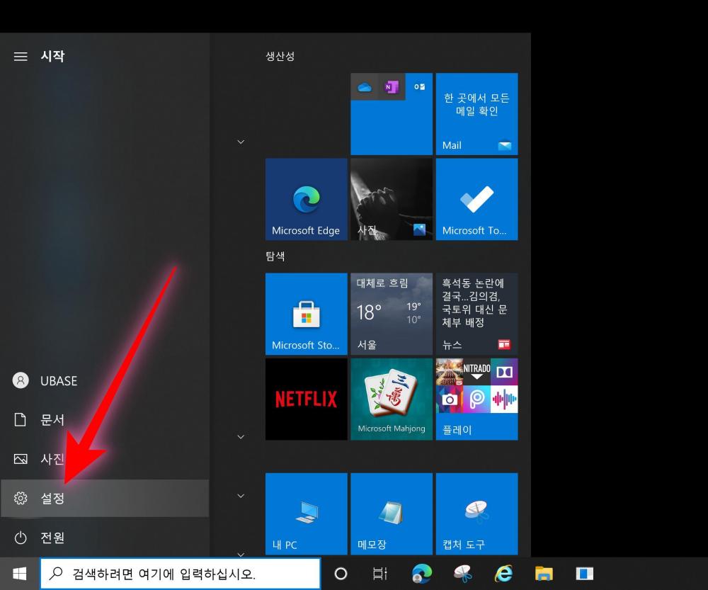첫 번째로 위와 같이 윈도우 시작 버튼을 누릅니다. 이후 빨간색 화살표가 가리키는 톱니 모양의 아이콘을 클릭합니다. 이 버튼이 윈도우10의 내부 기능을 관리할 수 있는 <설정> 버튼입니다.